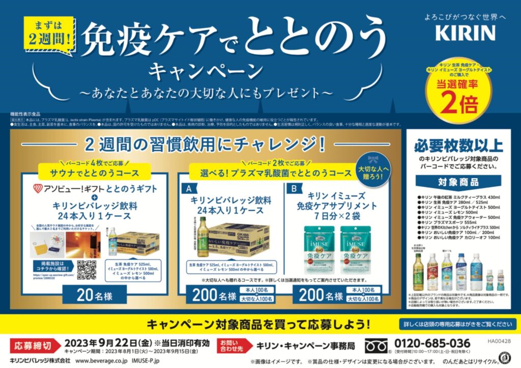 https://www.kirin.co.jp/area/2week-totonou/対象商品のバーコードで応募。抽選で賞品が当たるタイプ。