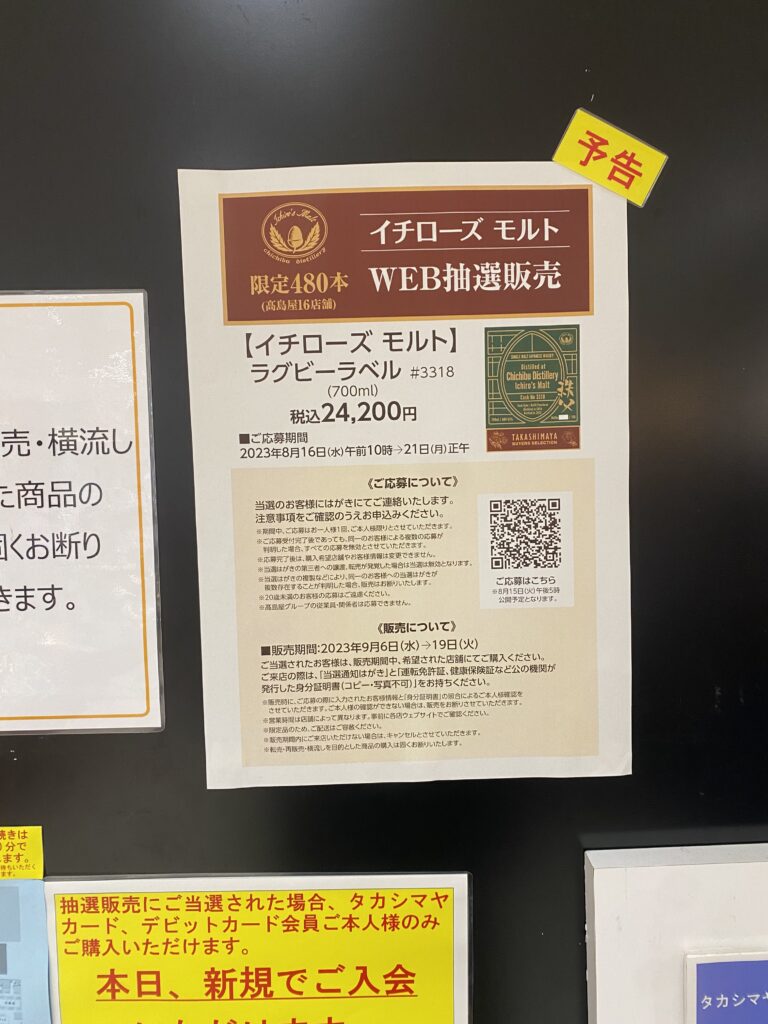また、2023年8月16日午前10時-21日正午までイチローズモルトラグビーラベルの抽選が行われます。限定480本というとんでもない倍率だと思いますが興味のある方は是非。