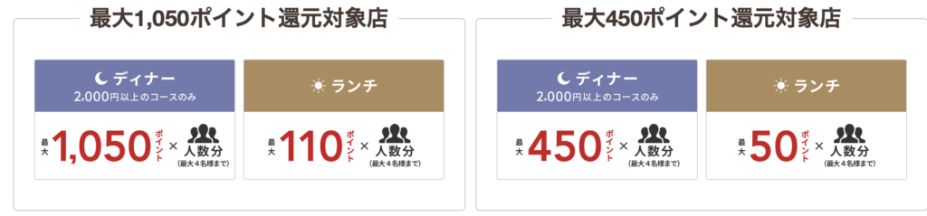 つまり最大1050ptのお店でのディナー予約で総計10人分の予約で還元限度となります。(1回の予約は4人までが特典対象)