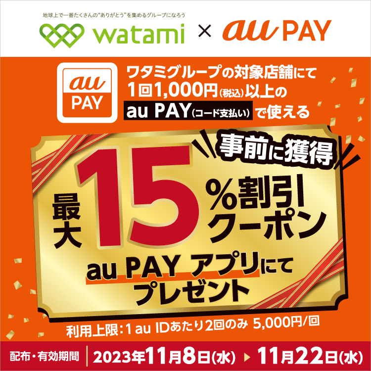2023年11月8日(水)~11月22日(水)までワタミグループの対象店舗にてau PAY(コード支払い)で1回1,000円(税込)以上のお支払いで使える最大15%割引クーポンがスタート。