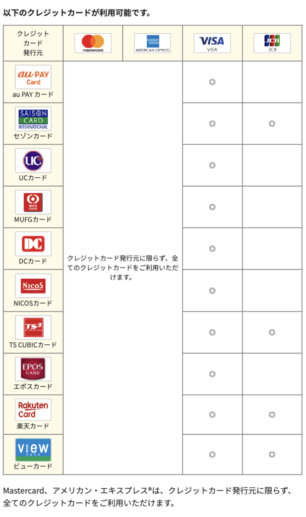 使えるクレジットカードは以下となります。