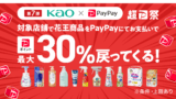 第7弾!花王商品の購入で最大30%戻ってくるキャンペーン - キャッシュレス決済のPayPay第7弾!キャンペーン期間中に、対象店舗にて花王対象商品を累計で税込3,000円以上お買い上げ(PayPayでお支払い)すると最大30%戻ってくる!