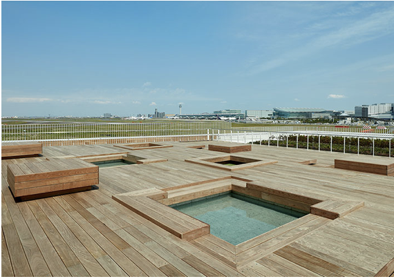 天空橋駅近辺の「HANEDA INNOVATION CITY」にある無料の足湯に浸かりながら飛行機を見るのもよし.