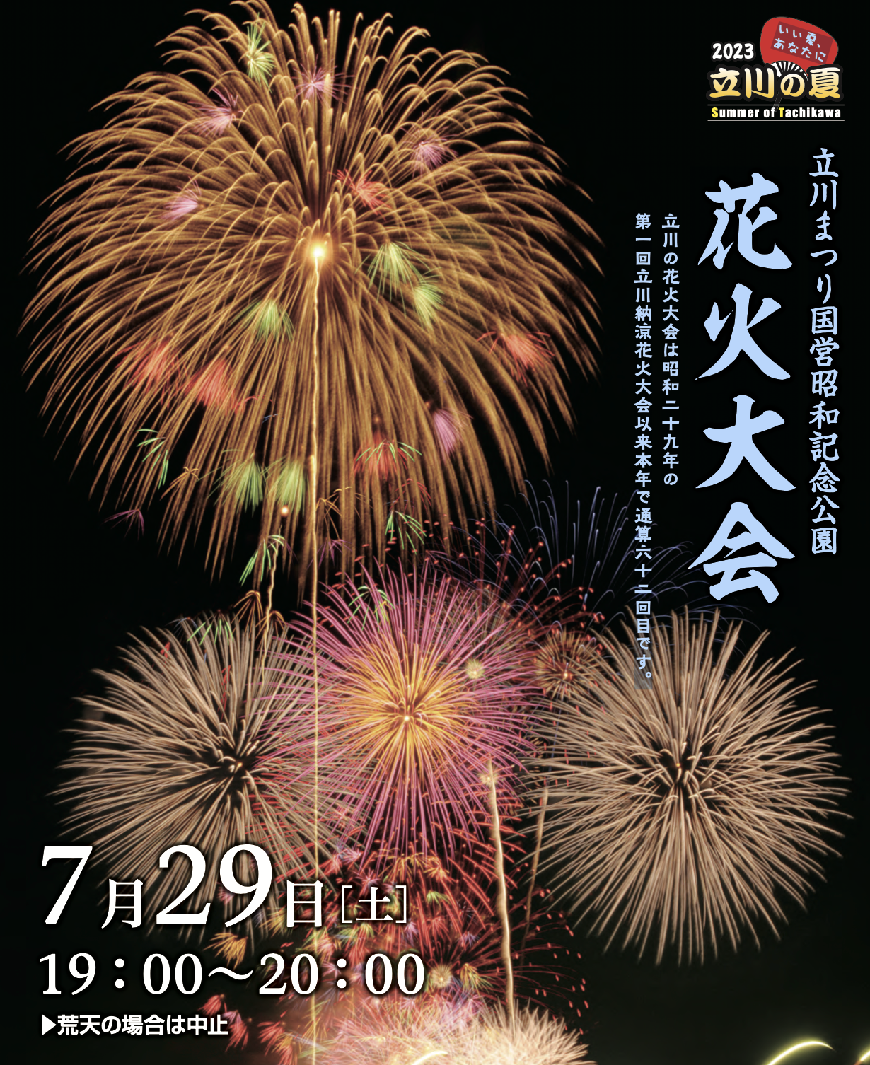 7月29日19時〜20時に昭和記念公園内で行われ、約5000発打ち上げられます。