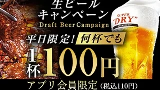 得情報7月27日から牛角でアプリ会員平日限定 中ジョッキ605円が何杯でも1杯につき110円。他キャンペーン併用攻略技。 7月27日から牛角でアプリ会員限定でアサヒスーパードライ 中ジョッキ550円(税込605円)が、何杯でも1杯につき100円(税込110円)のキャンペーンが開催。 また、ホットペッパー予約キャンペーンを利用した併用技も紹介。2023.07.30得情報